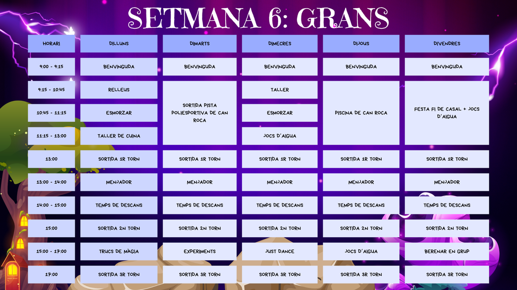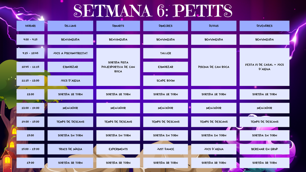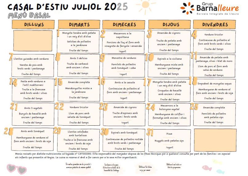 El menú i la programació (que pot variar per motius d'organització interna o factors metereològics) del casal ho podeu trobar més avall i per qualsevol dubte podeu consultar el dossier informatiu o enviar la vostra consulta al Whatsapp en horari de casal (de dilluns a divendres de 9.00h a 17.00h) al telèfon 635.816.475 (Rocío).